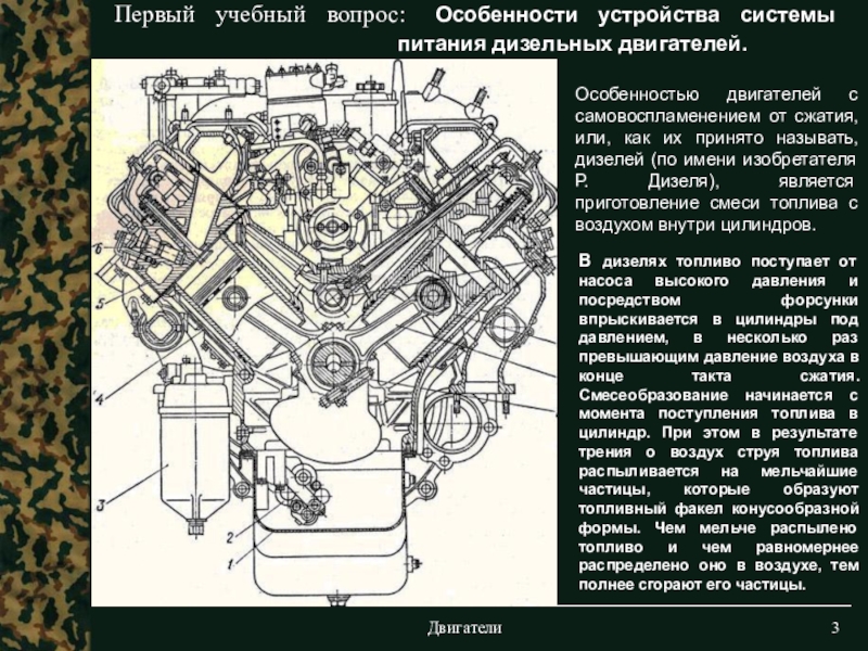 Особенностью двигателей с самовоспламенением от сжатия, или, как их принято называть, дизелей (по имени изобретателя Р. Дизеля), является приготовление смеси топлива с воздухом внутри цилиндров.
