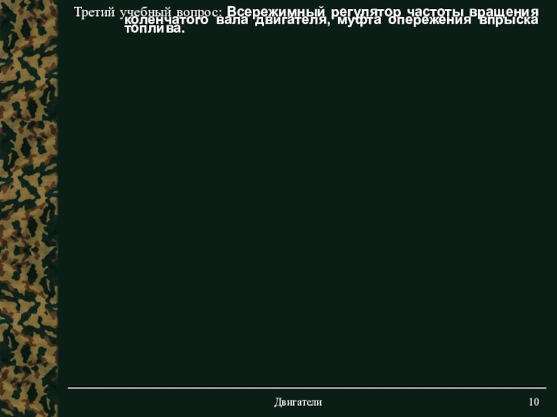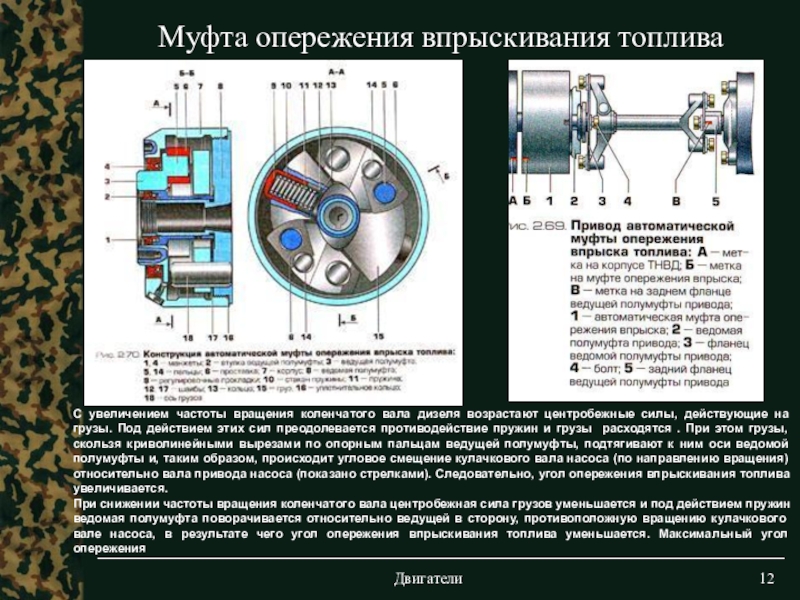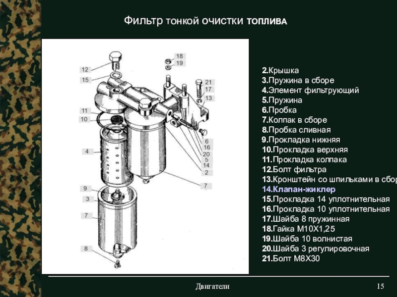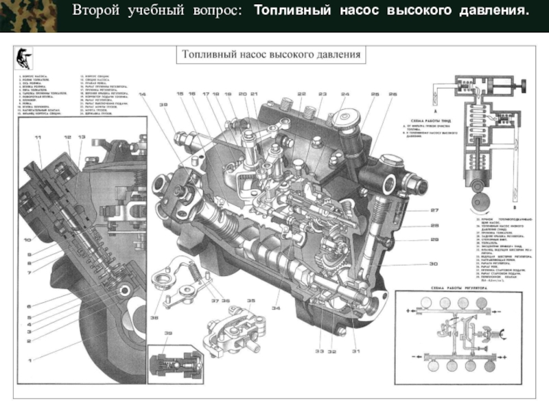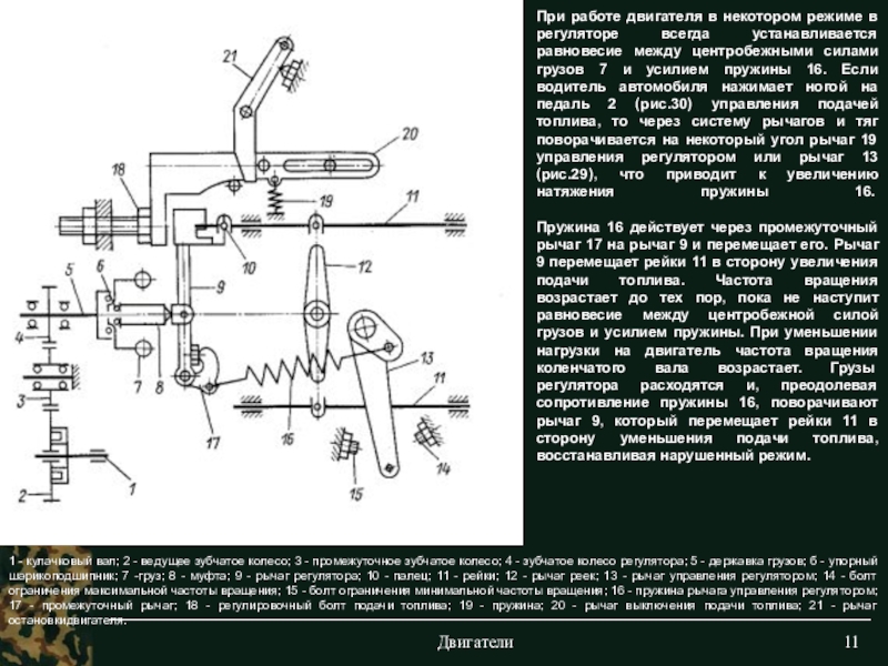 1 - кулачковый вал; 2 - ведущее зубчатое колесо; 3 - промежуточное зубчатое колесо; 4 - зубчатое колесо регулятора; 5 - державка грузов; б - упорный шарикоподшипник; 7 -груз; 8 - муфта; 9 - рычаг регулятора; 10 - палец; 11 - рейки; 12 - рычаг реек; 13 - рычаг управления регулятором; 14 - болт ограничения максимальной частоты вращения; 15 - болт ограничения минимальной частоты вращения; 16 - пружина рычага управления регулятором; 17 - промежуточный рычаг; 18 - регулировочный болт подачи топлива; 19 - пружина; 20 - рычаг выключения подачи топлива; 21 - рычаг остановкидвигателя.