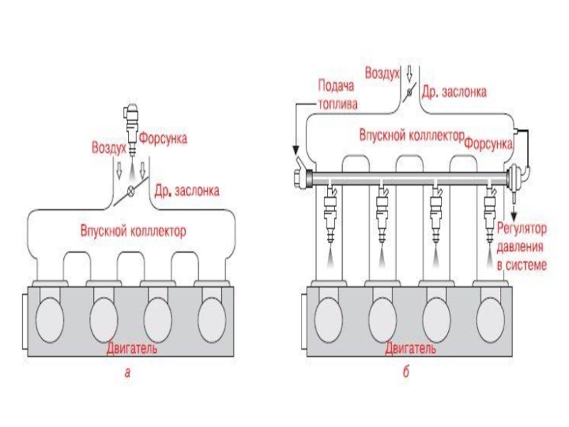 Слайд 8Распределённый впрыск — на каждый цилиндр приходится отдельная изолированная форсунка во впускном