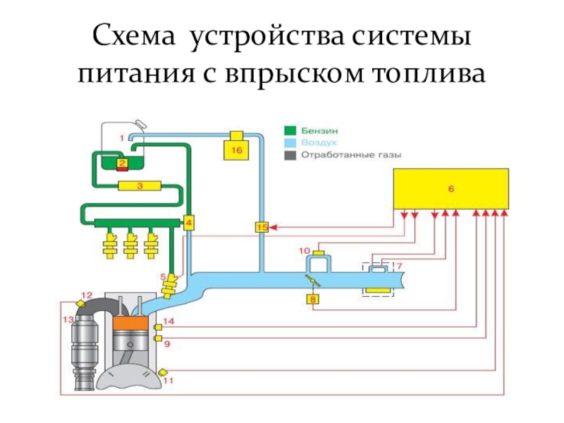 Слайд 10Схема устройства системы питания с впрыском топлива