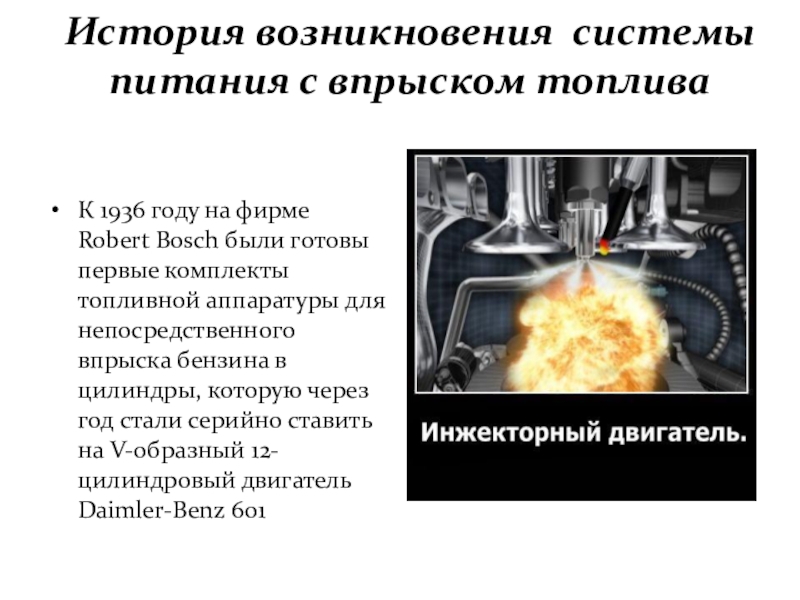 Robert Bosch были готовы первые комплекты топливной аппаратуры для непосредственного впрыска бензина в цилиндры, которую через год стали серийно ставить на V-образный 12-цилиндровый двигатель Daimler-Benz 601