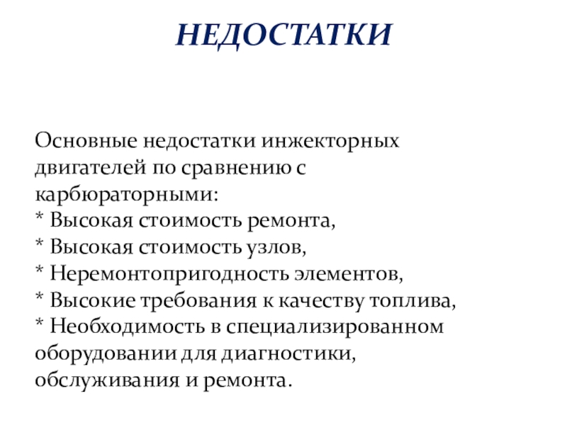 Основные недостатки инжекторных двигателей по сравнению с карбюраторными: