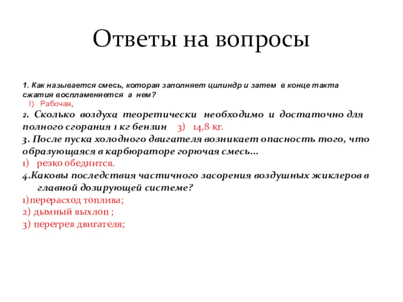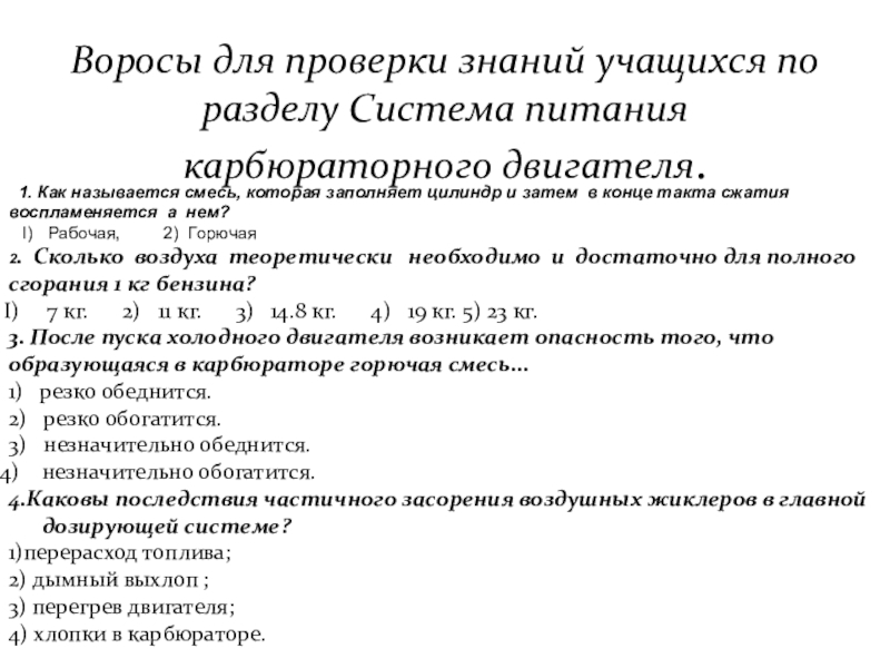 Воросы для проверки знаний учащихся по разделу Система питания карбюраторного двигателя.