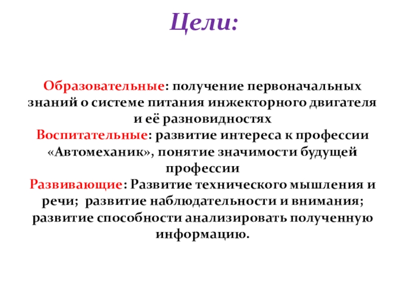 Образовательные: получение первоначальных знаний о системе питания инжекторного двигателя