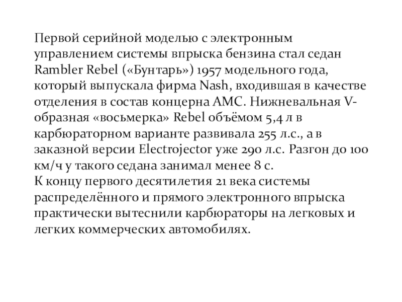Слайд 6Первой серийной моделью с электронным управлением системы впрыска бензина стал седан