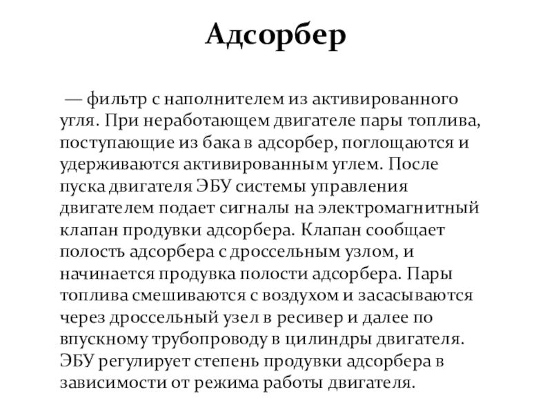 топлива, поступающие из бака в адсорбер, поглощаются и удерживаются активированным углем. После пуска двигателя ЭБУ системы управления двигателем подает сигналы на электромагнитный клапан продувки адсорбера. Клапан сообщает полость адсорбера с дроссельным узлом, и начинается продувка полости адсорбера. Пары топлива смешиваются с воздухом и засасываются через дроссельный узел в ресивер и далее по впускному трубопроводу в цилиндры двигателя. ЭБУ регулирует степень продувки адсорбера в зависимости от режима работы двигателя.