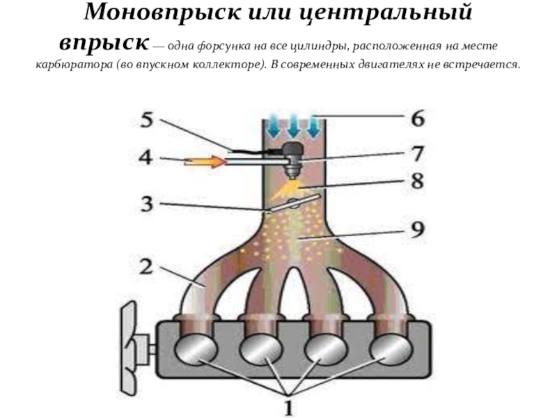 Слайд 7Моновпрыск или центральный впрыск — одна форсунка на все цилиндры, расположенная на