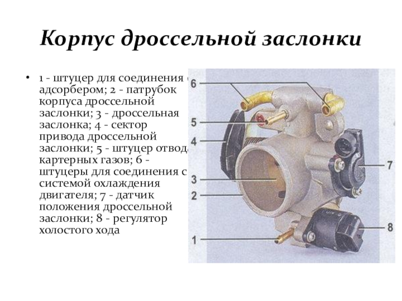 патрубок корпуса дроссельной заслонки; 3 - дроссельная заслонка; 4 - сектор привода дроссельной заслонки; 5 - штуцер отвода картерных газов; 6 - штуцеры для соединения с системой охлаждения двигателя; 7 - датчик положения дроссельной заслонки; 8 - регулятор холостого хода