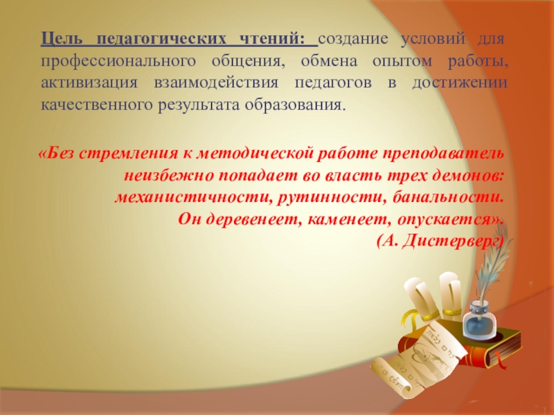 Цель педагогических чтений: создание условий для профессионального общения, обмена опытом работы, активизация взаимодействия педагогов в достижении качественного результата образования.
