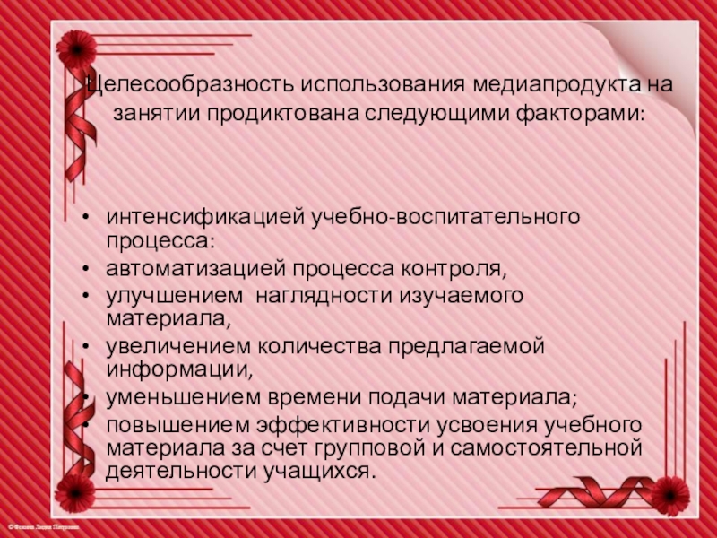 Слайд 5Целесообразность использования медиапродукта на занятии продиктована следующими факторами: