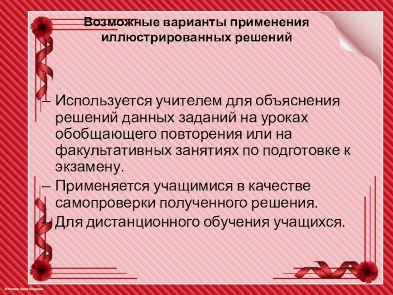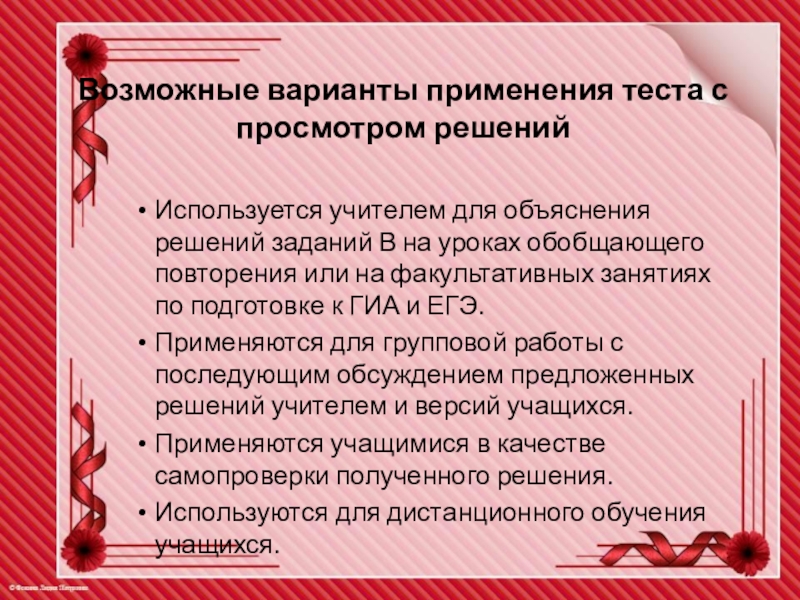 Слайд 6Возможные варианты применения теста с просмотром решений