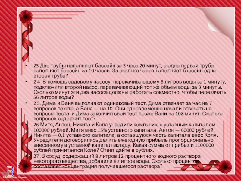23 Две трубы наполняют бассейн за 3 часа 20 минут, а