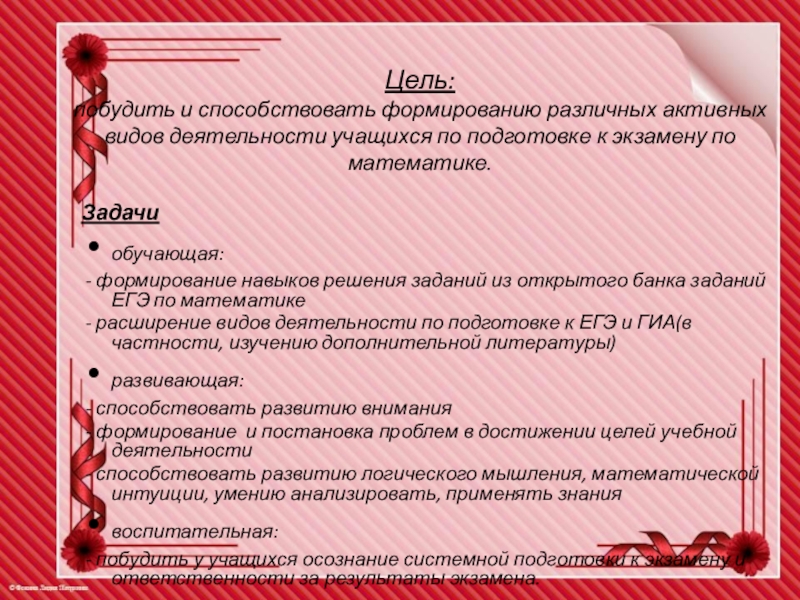 - побудить у учащихся осознание системной подготовки к экзамену и ответственности за результаты экзамена.