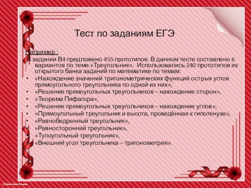 прототипов. В данном тесте составлено 6 вариантов по теме «Треугольник». Использовались 240 прототипов из открытого банка заданий по математике по темам: