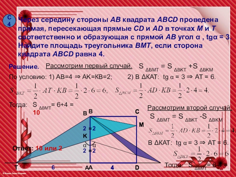 и AD в точках М и Т соответственно и образующая с прямой АВ угол α , tgα = 3. Найдите площадь треугольника ВМТ, если сторона квадрата ABCD равна 4.