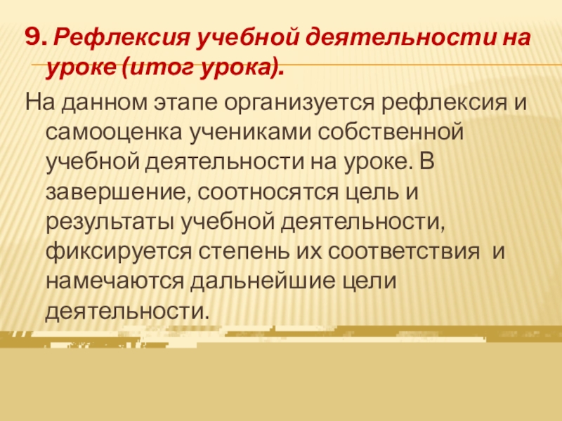 организуется рефлексия и самооценка учениками собственной учебной деятельности на уроке. В завершение, соотносятся цель и результаты учебной деятельности, фиксируется степень их соответствия и намечаются дальнейшие цели деятельности.