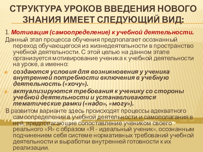 Данный этап процесса обучения предполагает осознанный переход обучающегося из жизнедеятельности в пространство учебной деятельности. С этой целью на данном этапе организуется мотивирование ученика к учебной деятельности на уроке, а именно: