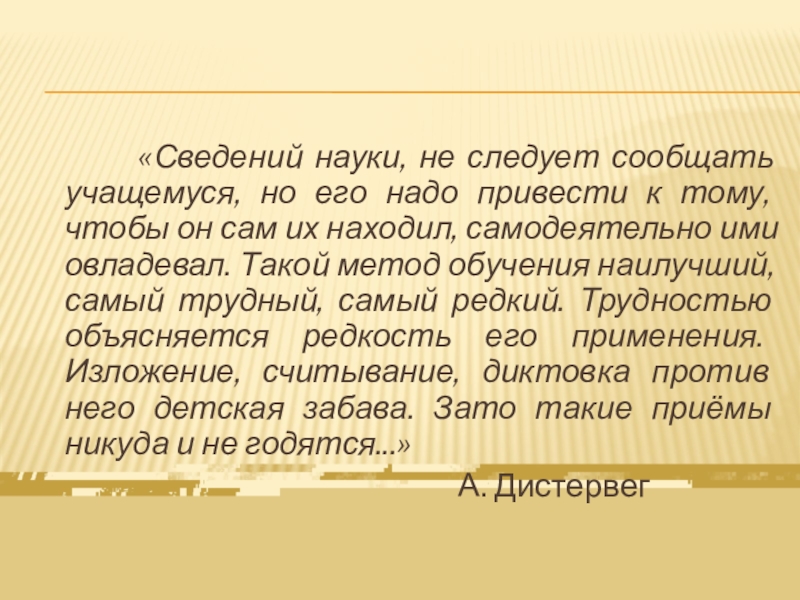 но его надо привести к тому, чтобы он сам их находил, самодеятельно ими овладевал. Такой метод обучения наилучший, самый трудный, самый редкий. Трудностью объясняется редкость его применения. Изложение, считывание, диктовка против него детская забава. Зато такие приёмы никуда и не годятся...»