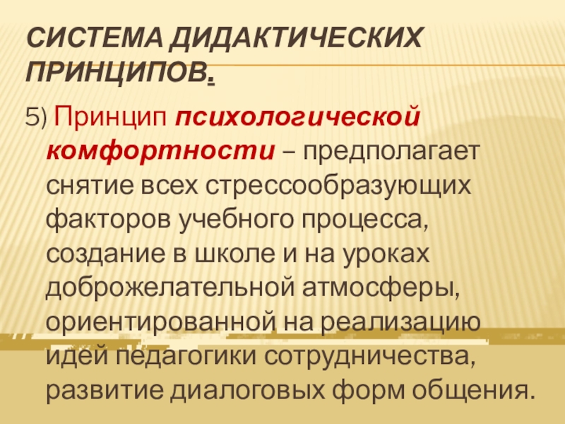 5) Принцип психологической комфортности – предполагает снятие всех стрессообразующих