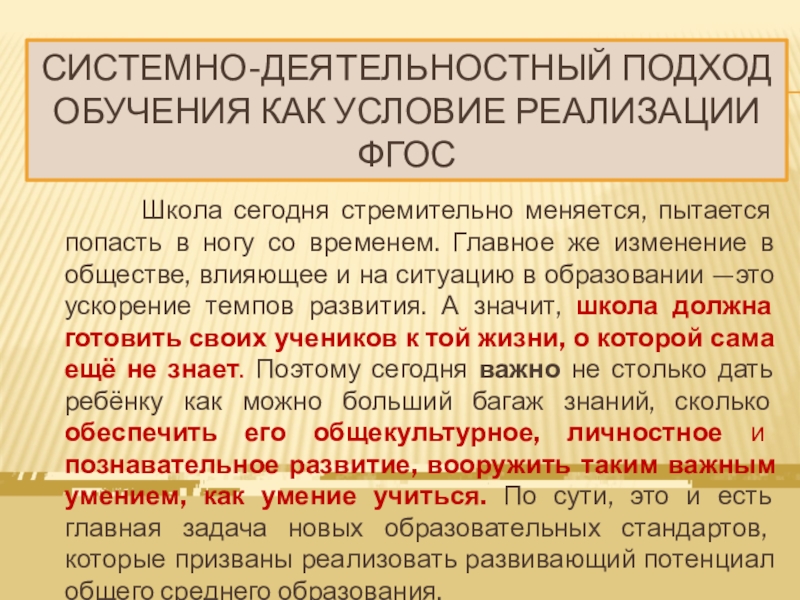 Школа сегодня стремительно меняется, пытается попасть в ногу со временем. Главное же изменение в обществе, влияющее и на ситуацию в образовании —это ускорение темпов развития. А значит, школа должна готовить своих учеников к той жизни, о которой сама ещё не знает. Поэтому сегодня важно не столько дать ребёнку как можно больший багаж знаний, сколько обеспечить его общекультурное, личностное и познавательное развитие, вооружить таким важным умением, как умение учиться. По сути, это и есть главная задача новых образовательных стандартов, которые призваны реализовать развивающий потенциал общего среднего образования.