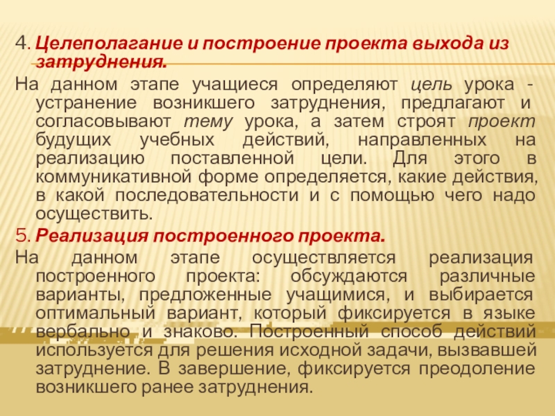На данном этапе осуществляется реализация построенного проекта: обсуждаются различные варианты, предложенные учащимися, и выбирается оптимальный вариант, который фиксируется в языке вербально и знаково. Построенный способ действий используется для решения исходной задачи, вызвавшей затруднение. В завершение, фиксируется преодоление возникшего ранее затруднения.