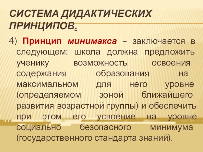 предложить ученику возможность освоения содержания образования на максимальном для него уровне (определяемом зоной ближайшего развития возрастной группы) и обеспечить при этом его усвоение на уровне социально безопасного минимума (государственного стандарта знаний).
