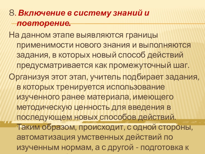 Организуя этот этап, учитель подбирает задания, в которых тренируется использование изученного ранее материала, имеющего методическую ценность для введения в последующем новых способов действий. Таким образом, происходит, с одной стороны, автоматизация умственных действий по изученным нормам, а с другой - подготовка к введению в будущем новых норм.