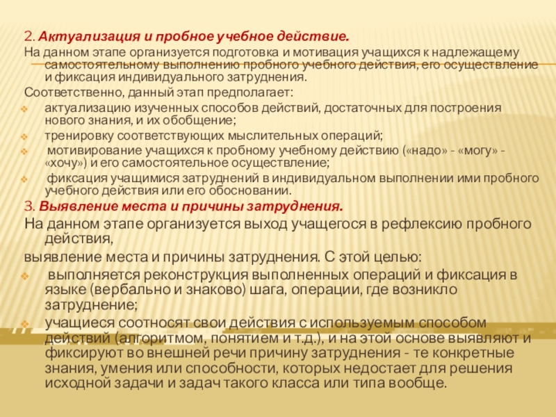 и мотивация учащихся к надлежащему самостоятельному выполнению пробного учебного действия, его осуществление и фиксация индивидуального затруднения.