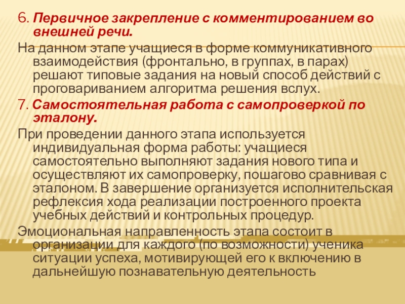 При проведении данного этапа используется индивидуальная форма работы: учащиеся самостоятельно выполняют задания нового типа и осуществляют их самопроверку, пошагово сравнивая с эталоном. В завершение организуется исполнительская рефлексия хода реализации построенного проекта учебных действий и контрольных процедур.