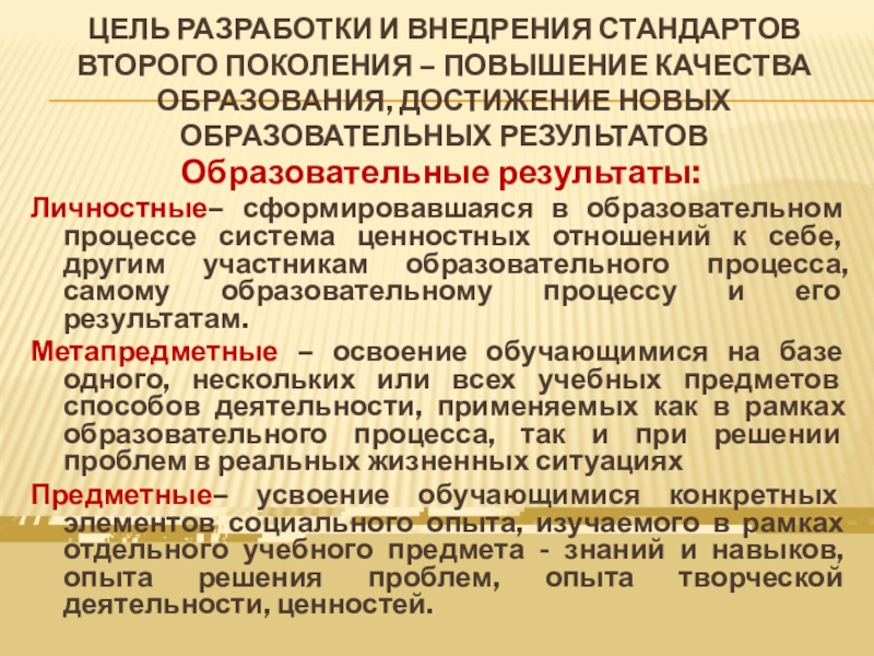 Слайд 4Цель разработки и внедрения стандартов второго поколения – повышение качества образования,