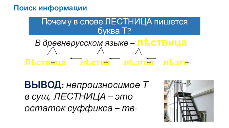 Слайд 11Почему в слове ЛЕСТНИЦА пишется буква Т?