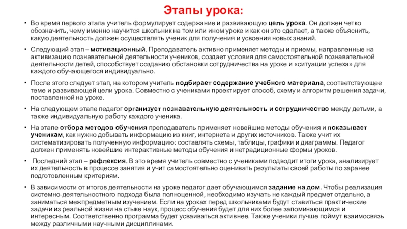 Во время первого этапа учитель формулирует содержание и развивающую цель