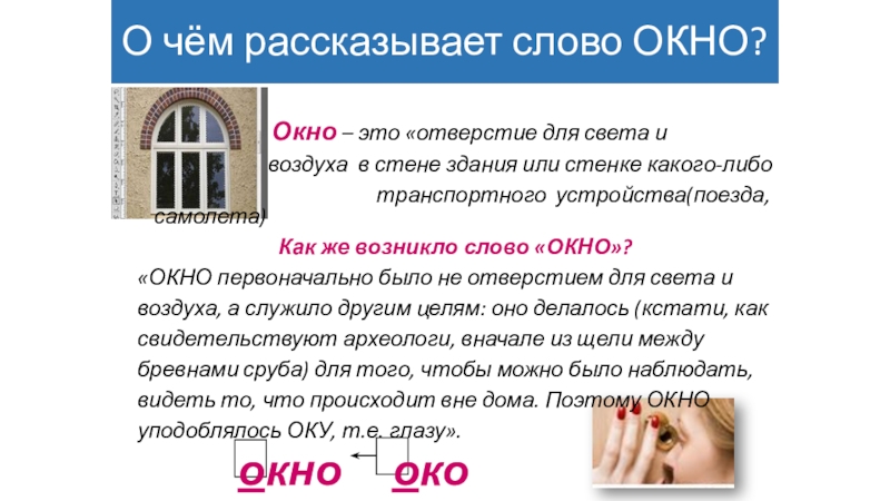 Слайд 12О чём рассказывает слово ОКНО?