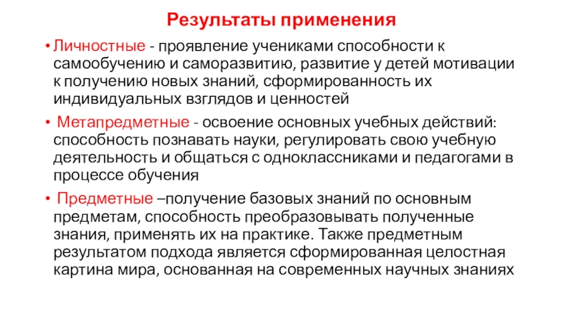 Предметные –получение базовых знаний по основным предметам, способность преобразовывать полученные знания, применять их на практике. Также предметным результатом подхода является сформированная целостная картина мира, основанная на современных научных знаниях