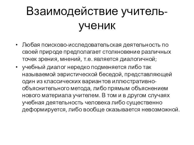учебный диалог нередко подменяется либо так называемой эвристической беседой, представляющей один из классических вариантов иллюстративно-объяснительного метода, либо прямым объяснением нового материала учителем. В том и в другом случаях учебная деятельность человека либо существенно деформируется, либо вообще оказывается невозможной.