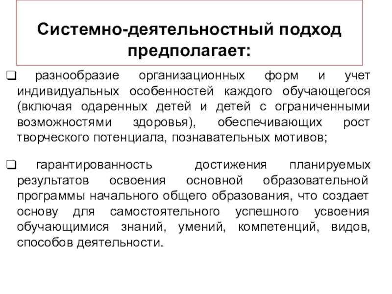 системно-деятельностный подход, концептуально базирующийся на обеспечении соответствия учебной деятельности обучающихся их возрасту и индивидуальным особенностям.