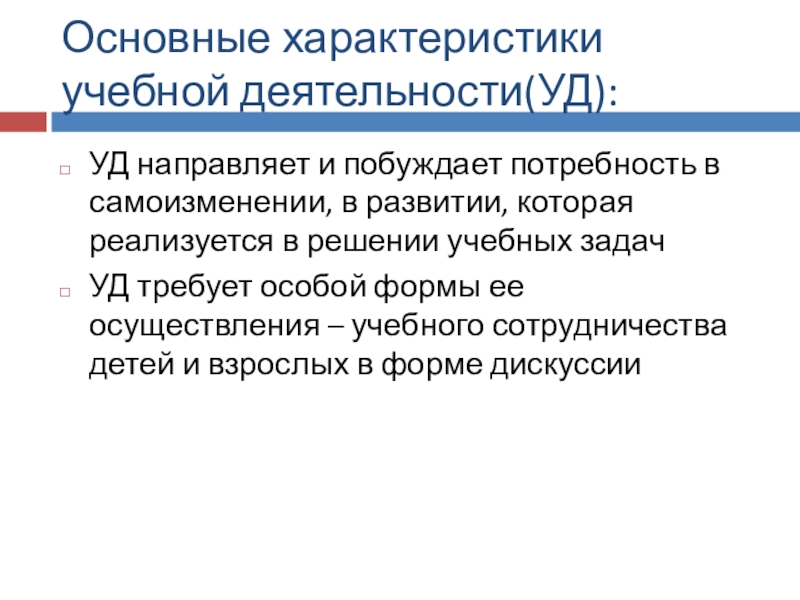 Слайд 13Основные характеристики учебной деятельности(УД):