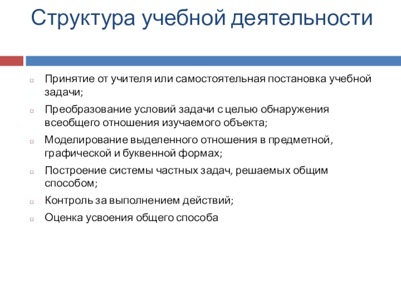 Освоение общего способа ни в коем случае не может быть его сообщением – информацией о нем. Оно должно быть выстроено как учебная деятельность, начинающаяся с предметно-практического действия. Реальное предметное действие в дальнейшем свертывается в модель-понятие. В модели общий способ действия зафиксирован в «чистом виде».