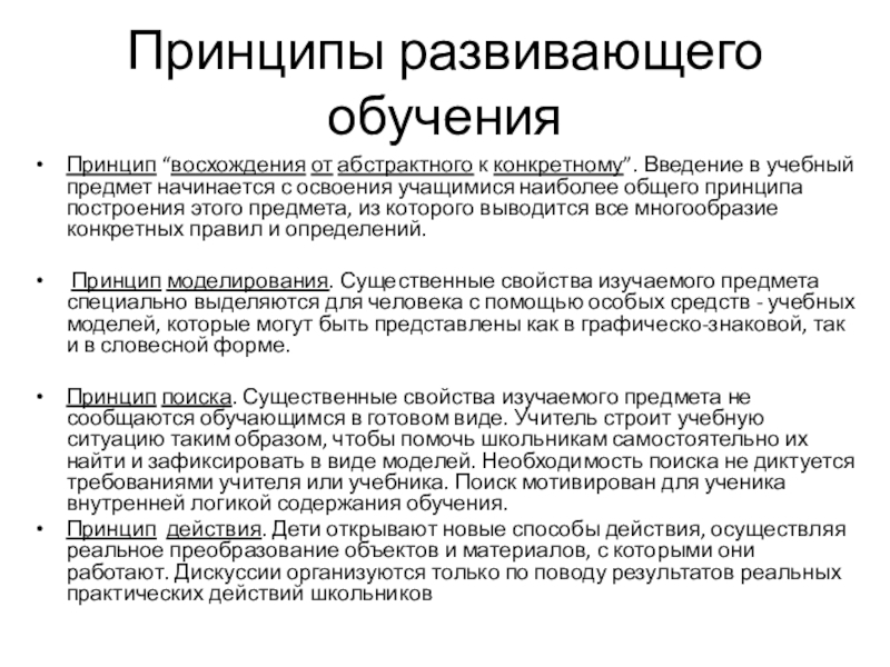 Принцип поиска. Существенные свойства изучаемого предмета не сообщаются обучающимся в готовом виде. Учитель строит учебную ситуацию таким образом, чтобы помочь школьникам самостоятельно их найти и зафиксировать в виде моделей. Необходимость поиска не диктуется требованиями учителя или учебника. Поиск мотивирован для ученика внутренней логикой содержания обучения.
