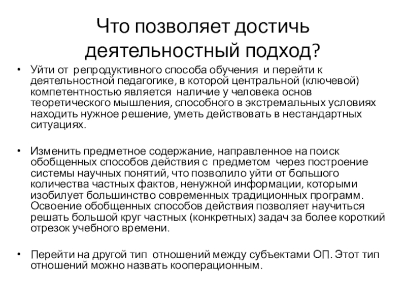 к деятельностной педагогике, в которой центральной (ключевой) компетентностью является наличие у человека основ теоретического мышления, способного в экстремальных условиях находить нужное решение, уметь действовать в нестандартных ситуациях.