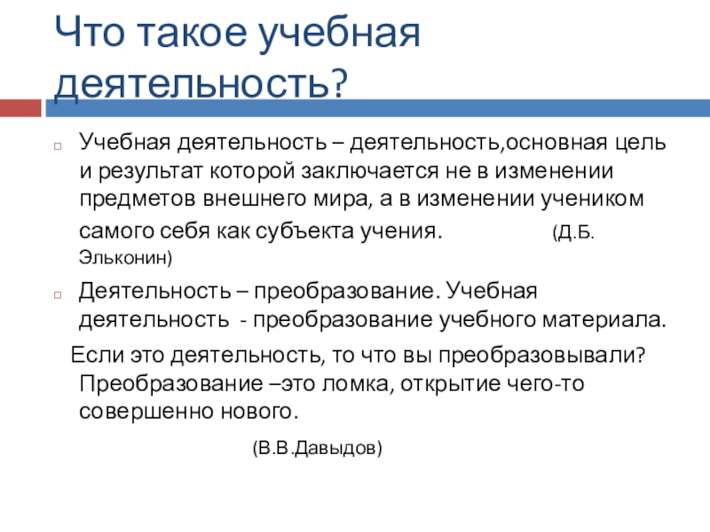 Деятельность – преобразование. Учебная деятельность - преобразование учебного материала.