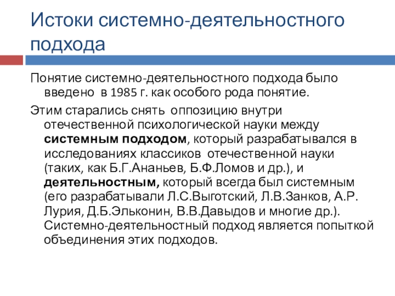 Этим старались снять оппозицию внутри отечественной психологической науки между системным подходом, который разрабатывался в исследованиях классиков отечественной науки (таких, как Б.Г.Ананьев, Б.Ф.Ломов и др.), и деятельностным, который всегда был системным (его разрабатывали Л.С.Выготский, Л.В.Занков, А.Р.Лурия, Д.Б.Эльконин, В.В.Давыдов и многие др.). Системно-деятельностный подход является попыткой объединения этих подходов.