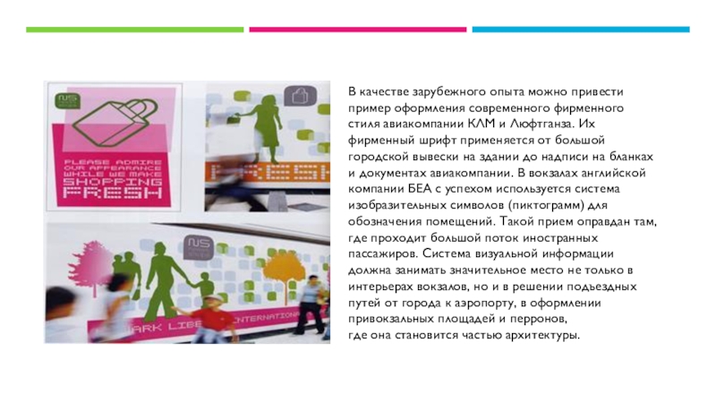 авиакомпании КЛМ и Люфтганза. Их фирменный шрифт применяется от большой городской вывески на здании до надписи на бланках и документах авиакомпании. В вокзалах английской компании БЕА с успехом используется система изобразительных символов (пиктограмм) для обозначения помещений. Такой прием оправдан там, где проходит большой поток иностранных пассажиров. Система визуальной информации должна занимать значительное место не только в интерьерах вокзалов, но и в решении подъездных путей от города к аэропорту, в оформлении привокзальных площадей и перронов,