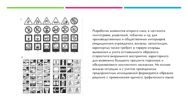 Слайд 9Разработка элементов второго слоя, в частности пиктограмм, указателей, табличек и пр.