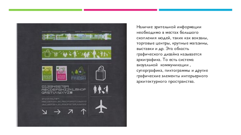 вокзалы, торговые центры, крупные магазины, выставки и др. Эта область графического дизайна называется архиграфика. То есть система визуальной коммуникации , суперграфика, пиктограммы и другие графические элементы интерьерного архитектурного пространства.