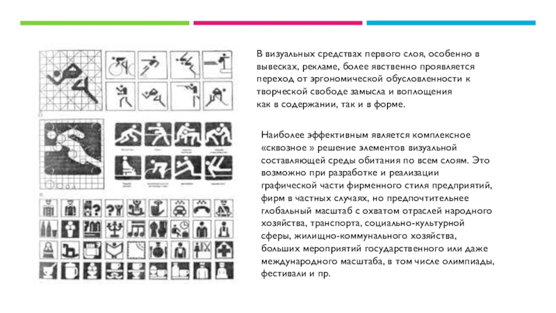 «сквозное » решение элементов визуальной составляющей среды обитания по всем слоям. Это возможно при разработке и реализации графической части фирменного стиля предприятий, фирм в частных случаях, но предпочтительнее глобальный масштаб с охватом отраслей народного хозяйства, транспорта, социально-культурной сферы, жилищно-коммунального хозяйства, больших мероприятий государственного или даже международного масштаба, в том числе олимпиады, фестивали и пр.