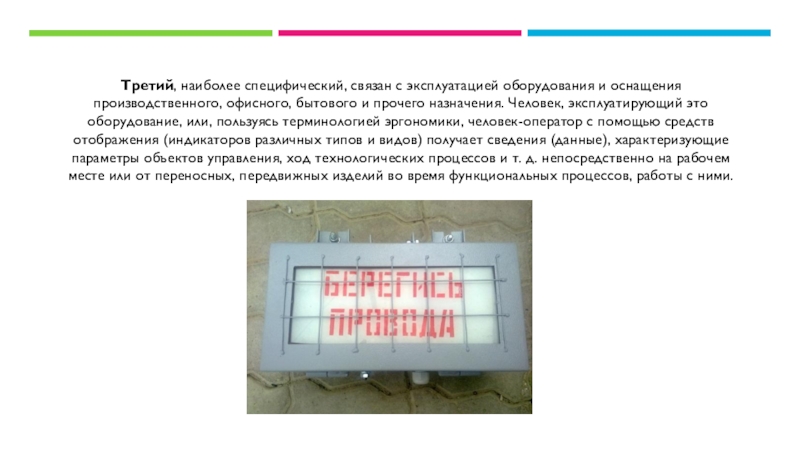 Слайд 7Третий, наиболее специфический, связан с эксплуатацией оборудования и оснащения производственного, офисного,