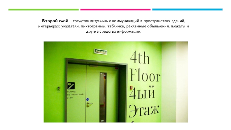 Слайд 6Второй слой – средства визуальных коммуникаций в пространствах зданий, интерьерах: указатели,