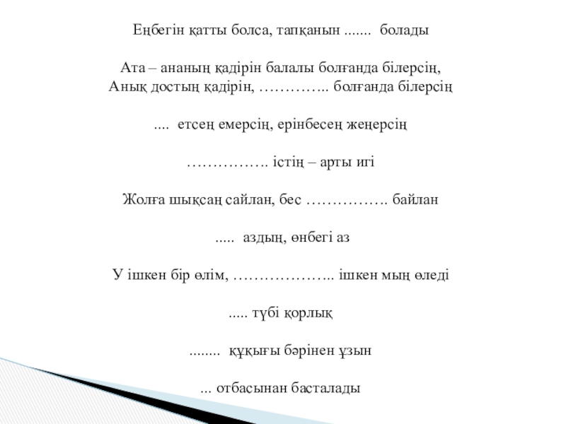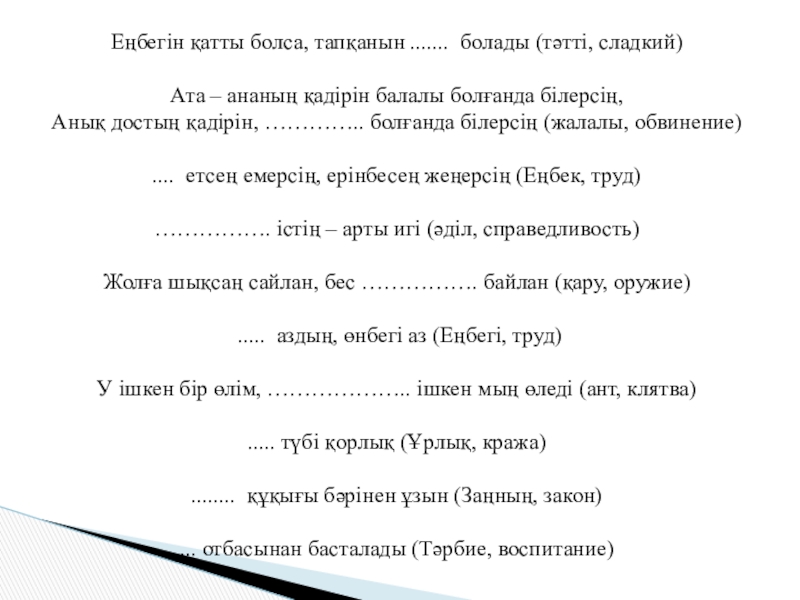 Еңбегін қатты болса, тапқанын ....... болады (тәтті, сладкий)Ата – ананың қадірін балалы болғанда білерсің,Анық достың қадірін, …………..