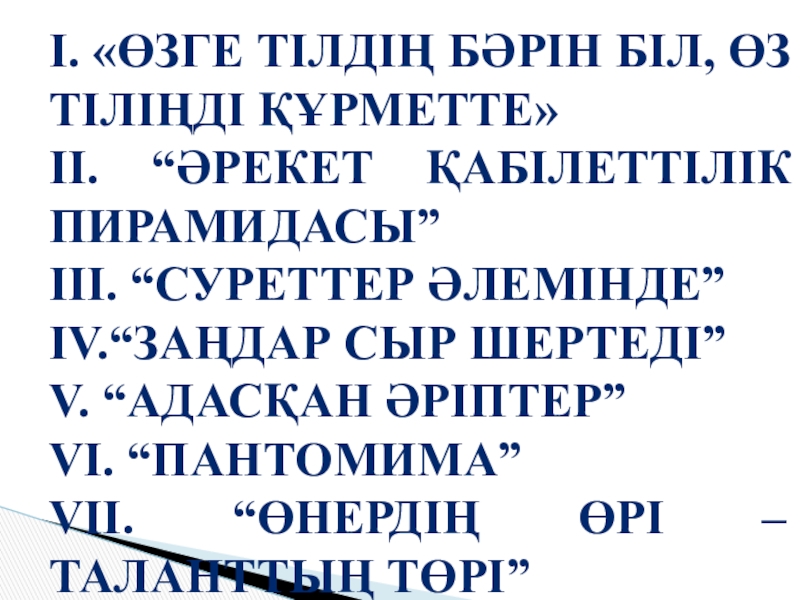 i. «Өзге тілдің бәрін біл, өз тіліңді құрметте»ii. “әрекет қабілеттілік пирамидасы”iii. “суреттер әлемінде”iv.“заңдар сыр шертеді”v. “адасқан әріптер”vi. “Пантомима”VII. “өнердің өрі – таланттың төрі”